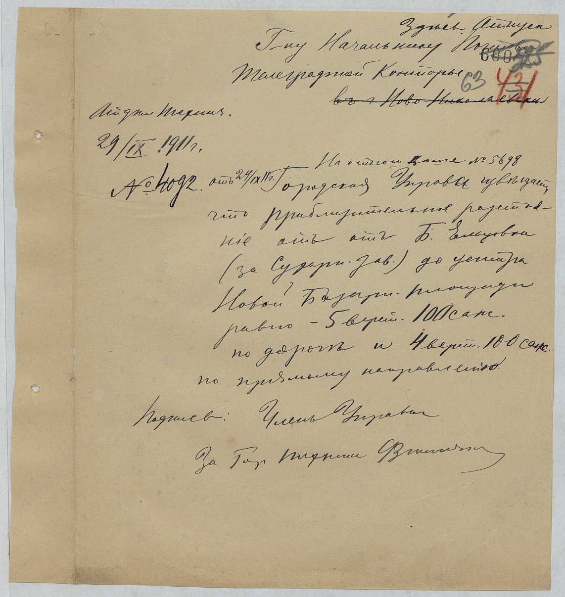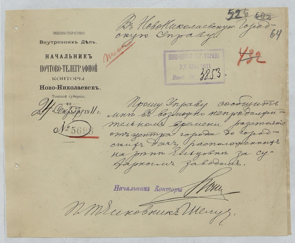 Первая - запрос начальника почтово-телеграфной конторы о расстоянии от города до дач, а вторая - ему ответ, с указанием расстояния как напрямую, так и вдоль дорог.
