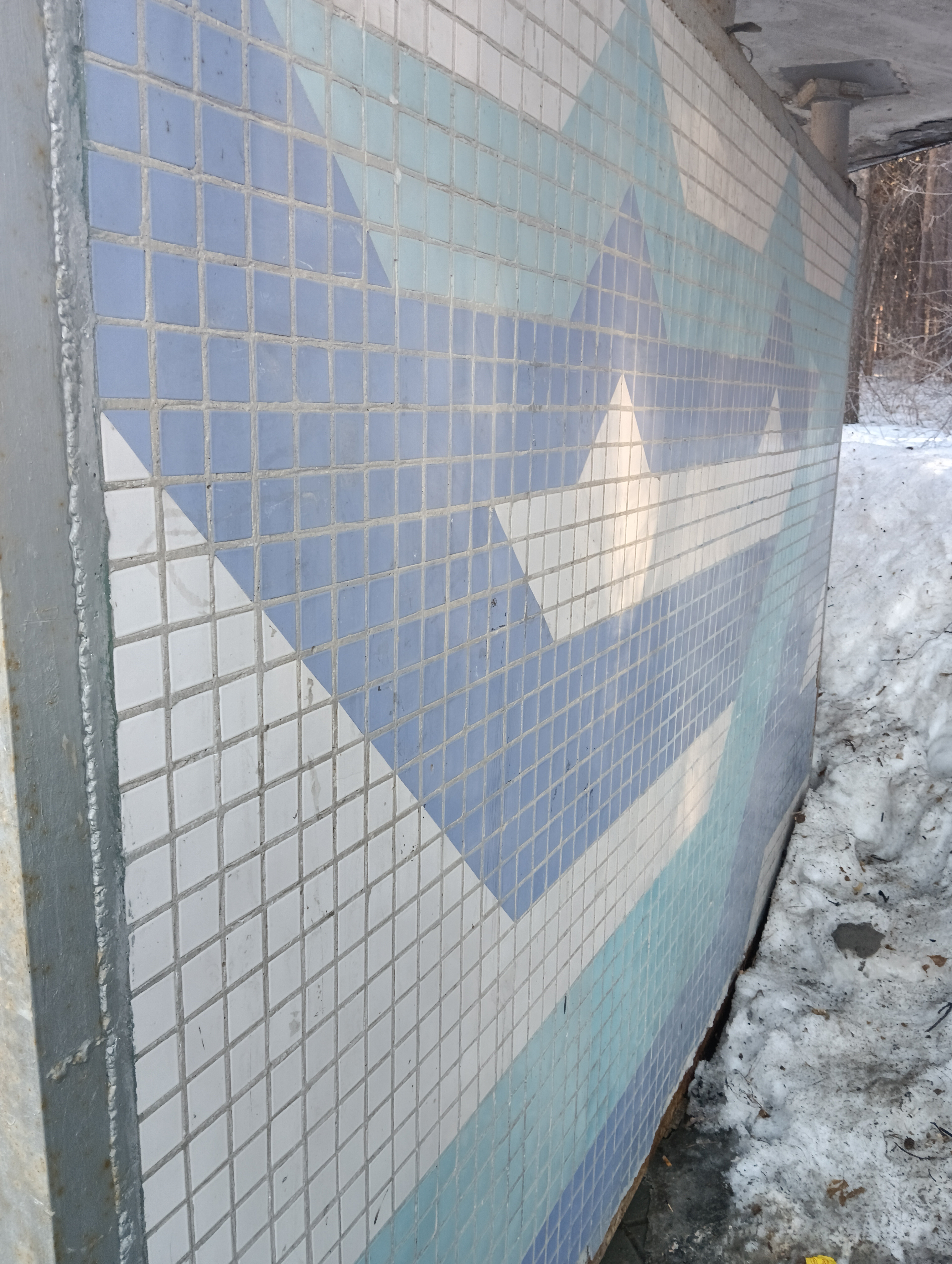 К примеру, не исключено, что эта мозаика так и была в былые годы завандалена на цветные плитки: Панно "Покорители Оби"