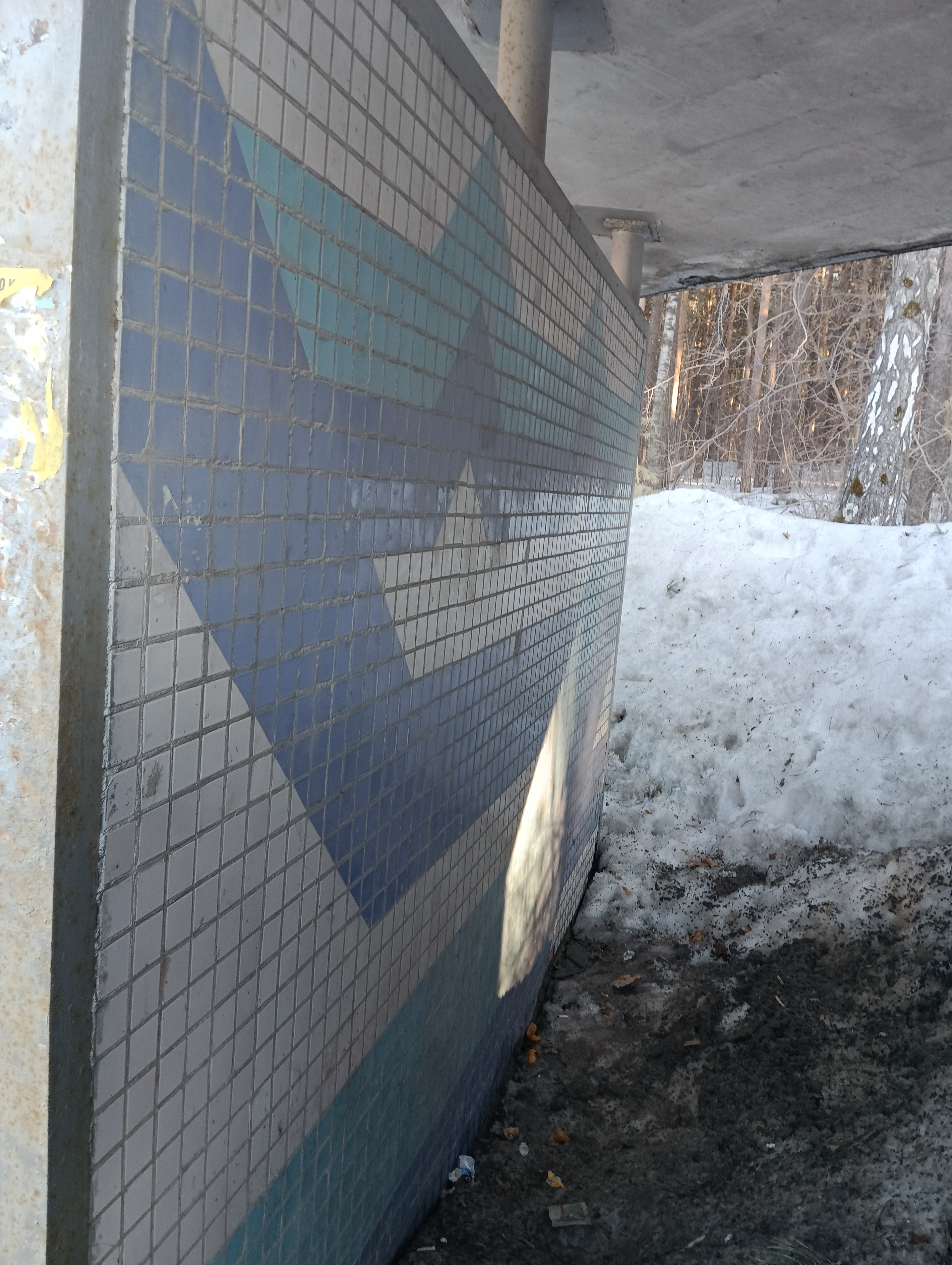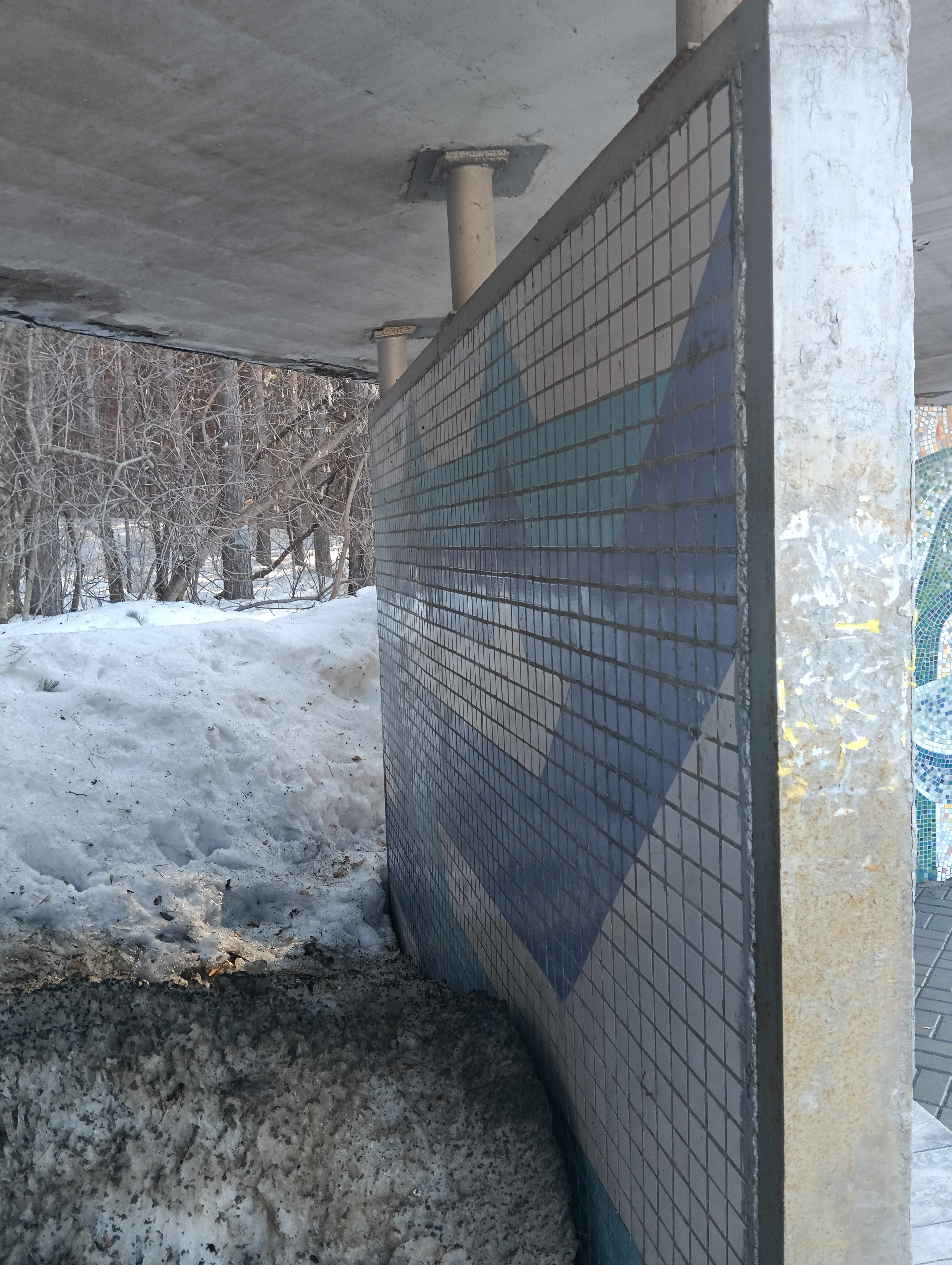 Стекло мололи сами, клей делали сами, смальту тоже. Делали капитально, с рассчётом на то, что снегоуборочная техника возможно будет на эту мозаику откидывать обледеневшие куски снега с камушками, стеклянными бутылками и прочим. Остановка проектрировалась выдерживать самое суровое использование.