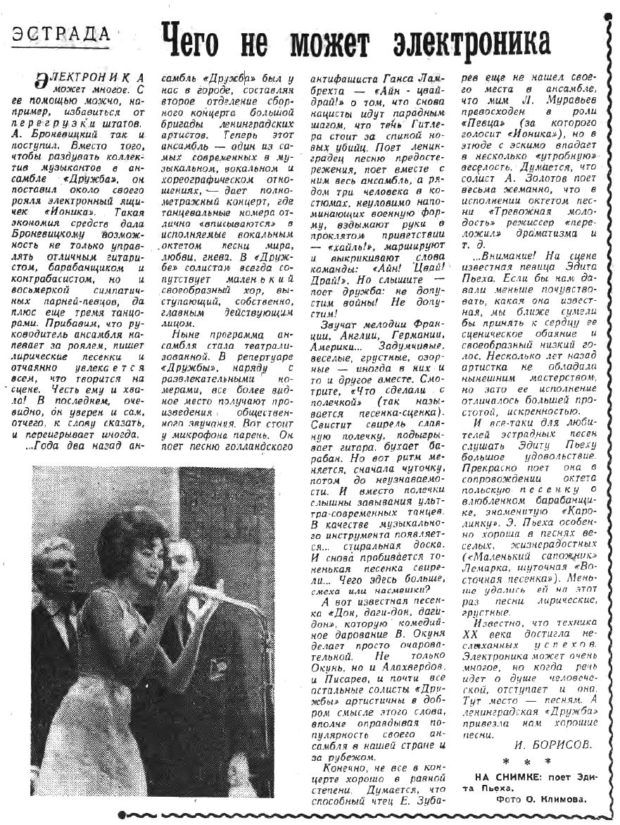 Эдита Пьеха и вокально инструментальный ансамбль "Дружба" под управлением Александра Броневицкого в Новосибирском Академгородке 1964 г.