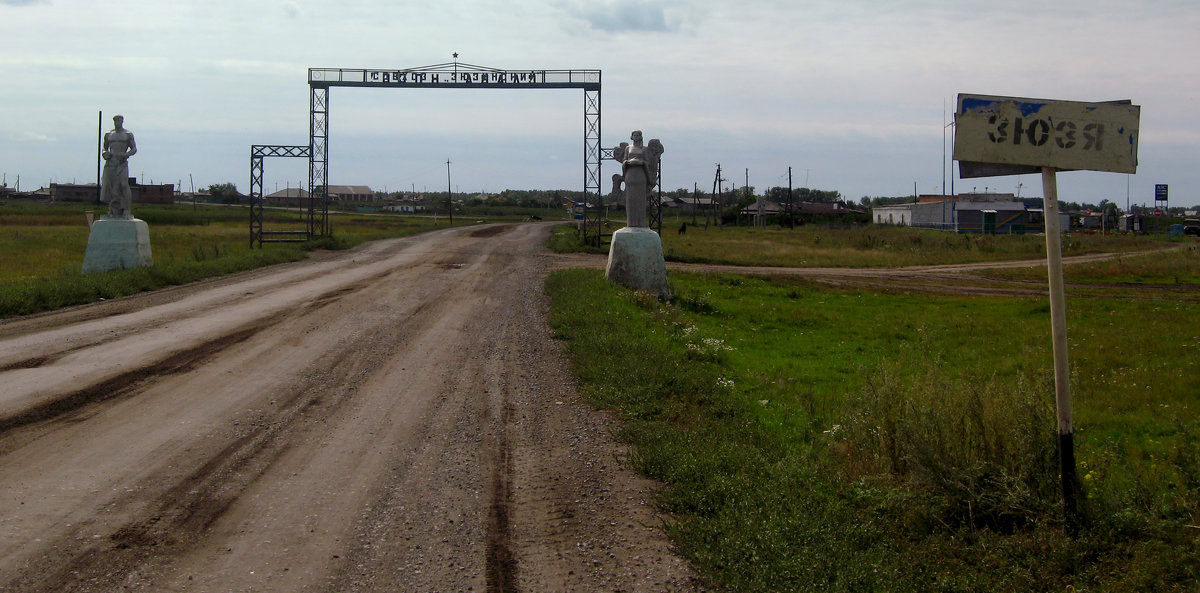 На въезде приезжих встречают крестьянин и крестьянка, которых в селе зовут Паша и Маша, — в честь членов семьи сотрудников больше не существующего совхоза.
