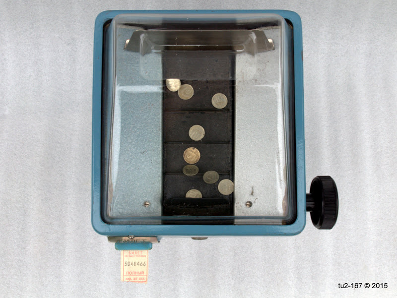 Пассажир бросал 6 копеек (в европейской части СССР - 5, как будто нефть у них добывали, а не у нас) и крутил рукоятку, а потом отрывал выехавший билетик от ленты. В это время 6 копеек ехали по конвееру под плексиглазовым колпаком. Очевидно это было для того, чтобы другие пассажиры видели: человек действительно бросил деньги и не хочет получить билет на халяву.