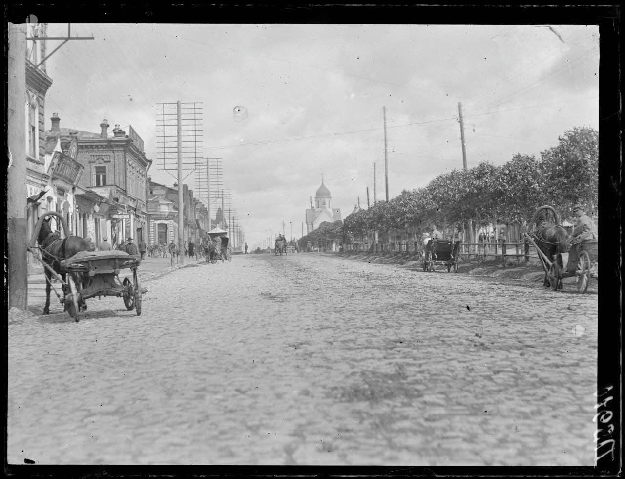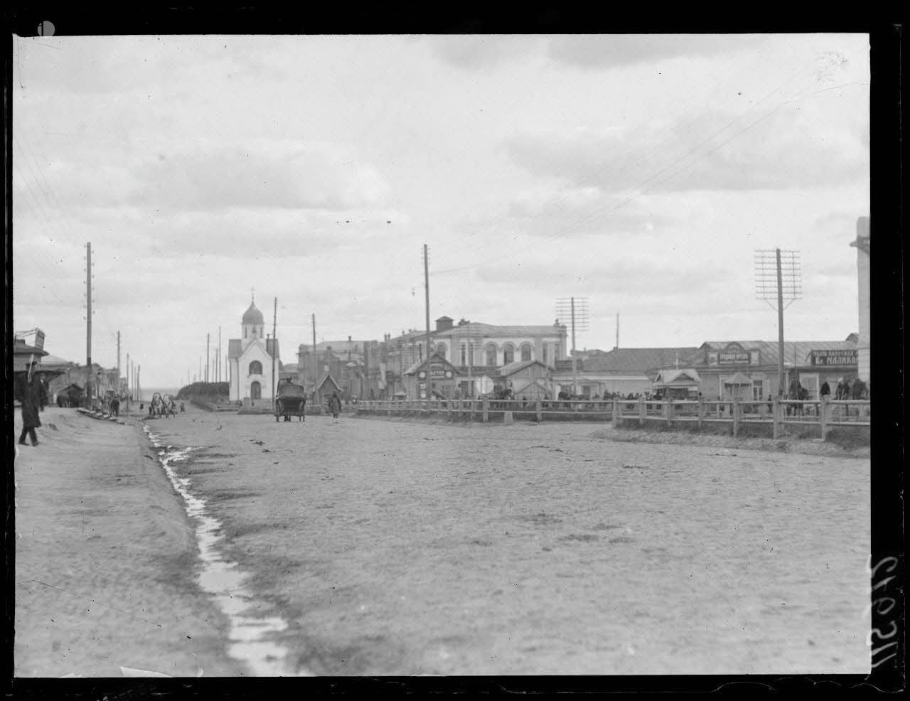 Не вижу ничего странного в данном способе фотографирования. Фотоаппарат, разумеется, не стоял на земле, а был на уровне груди, судя по окружающим предметам. Негатив, предположу, примерно 9х12 см, если прикинуть размер надписей на полях. камера достаточно большая, но снимать можно и с рук. С таким ракурсом тогда все так фотографировали. В качестве примера привожу известную открытку из раннего Новониколаевска. Посмотрите: великолепное море грязи, а где-то по бокам мелкие домишки. Улица Бийская. Чешский фотограф даже польстил новониколаевцам и отснял некие признаки цивилизации: булыжную мостовую, кирпичные здания и часовню с куполом