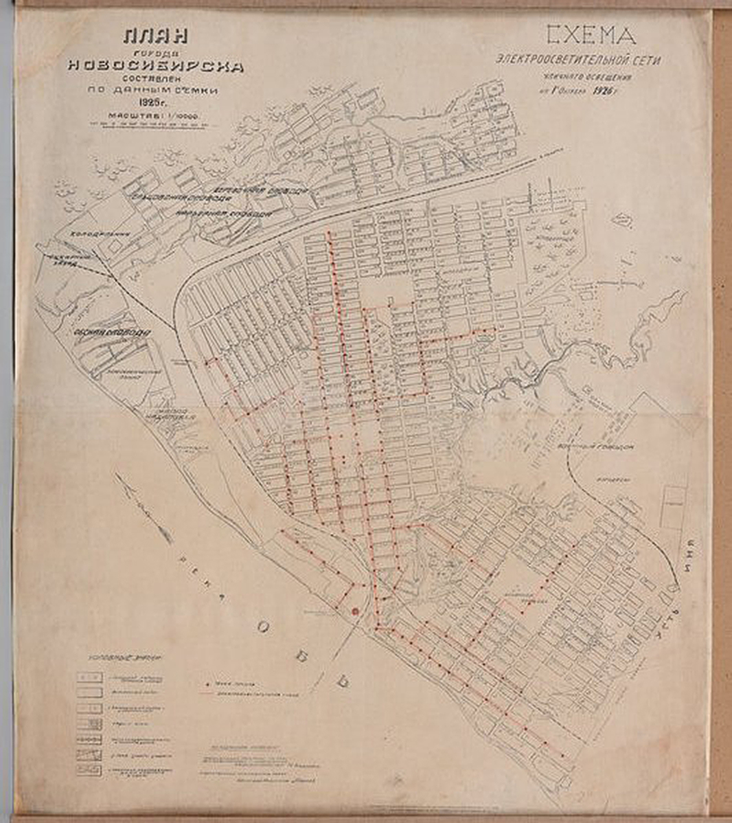 Я как-то находил на ГОСКАТАЛОГЕ такой вот план: 1926 План города Новосибирска с нанесенной на нем схемой электроосветительной сети уличного освещения.