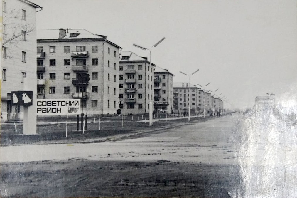 На этом фото эмблема совсем другая. И возникает множество вопросов: когда появилась первая, неофициальная, эмблема Советского района? Кто был автор? Как выглядела? Где она использовалась в декоративном оформлении архитектуры района (на стелах, памятниках, указателях, административных зданиях)? Сколько раз эмблема менялась? Та эмблема, которую мы видим на фото, это самая первая версия эмблемы района или уже одна из последующих?