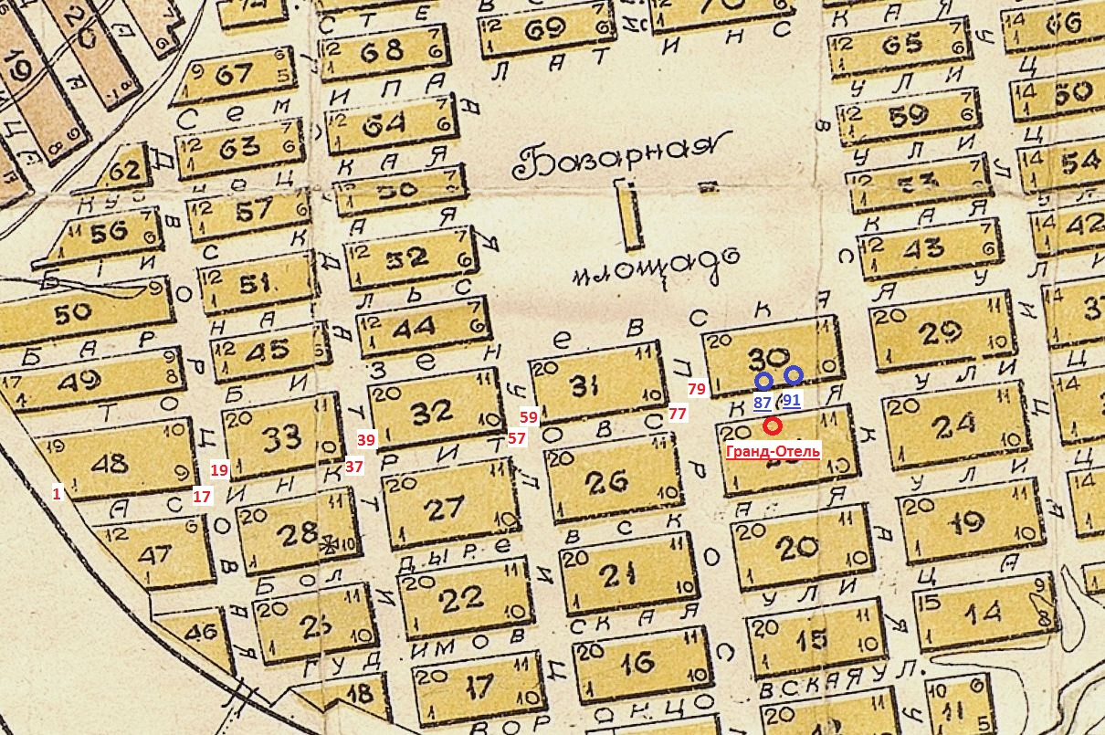 Я собирала практически на пальцах, т.ч. всё +-. Топосъёмка - это хорошо, к номерам теперь надо привязать. Пусть этот дом на усадьбе Михалёва, м.16. Он ли бывший Гранд-Отель, правильно ли я определила ? Или он дальше, т.е дом, например, место 13?