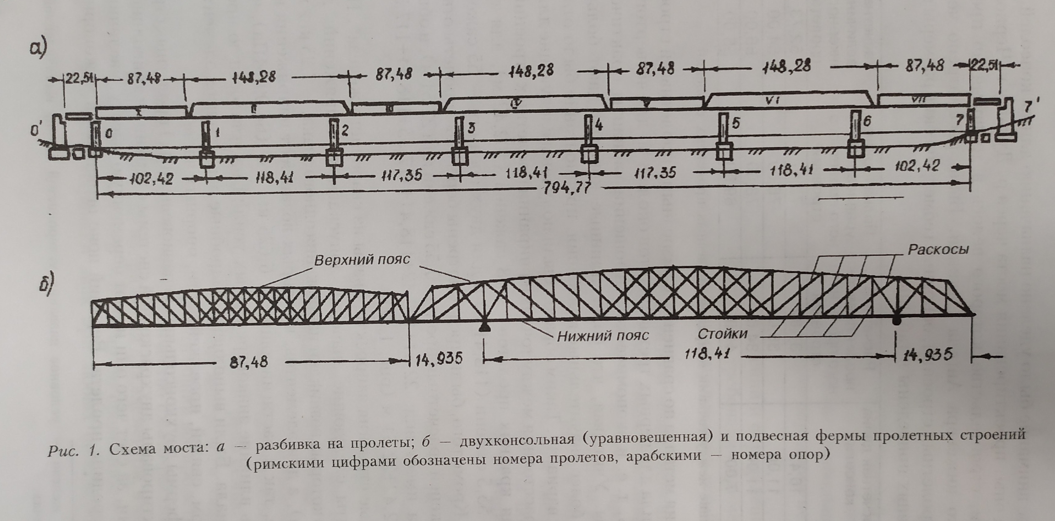 Мост состоял из восьми опор и соответственно из семи отверстий (по старой терминологии)